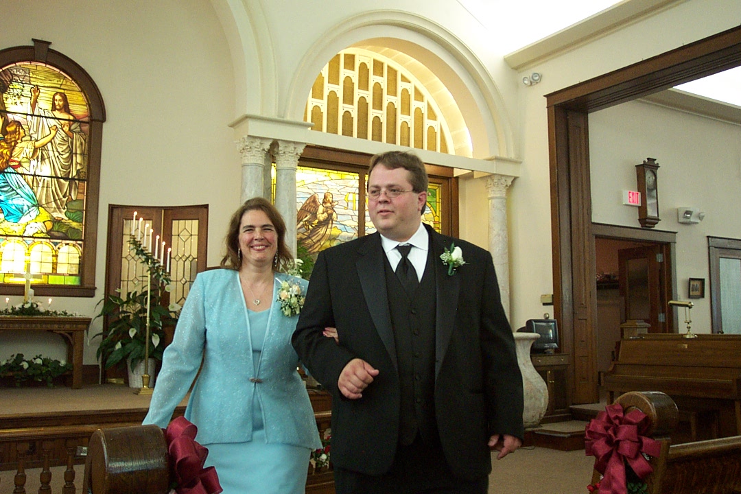 On the left is my new daughter-in law Megan, who was one of Katie's bridesmaids. On the right is Christi, my daughter who was matron of honor. To the far right is my Dad. In the picture above my oldest son Michael walks his mother Dianne down the aisle as Mother of the Bride.